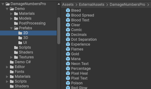 Damage Numbers Proのインストール先のDemo/Prefabsフォルダ以下に