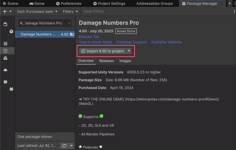 Asset Storeで購入したら、Package Managerからダウンロードしてインポートします。