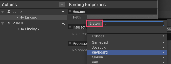 Listenボタンを押すことで入力待ちになり、実際のキーやボタンを入力することで候補を絞り込むことができます。