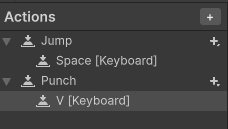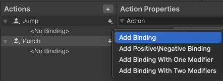アクションに入力を割り当てるには、アクション名の右にある+ボタンからBindingを選択します。