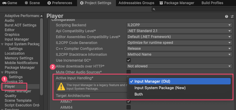 いずれかのプラットフォームのOther Settingsの中にActive Input Handlingがあるので確認します。