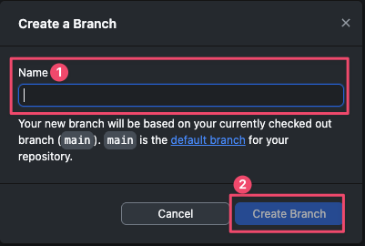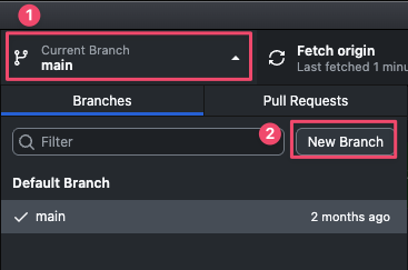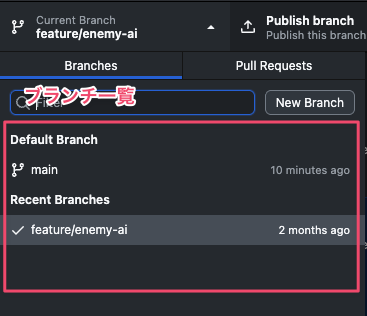 ちなみに作成したブランチの一覧は「Current Branch」を押すことで確認できます。