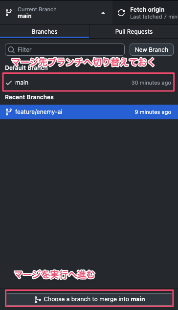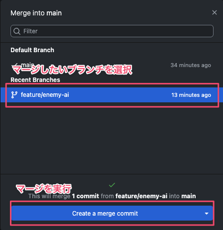 mainブランチ)「Choose a branch to merge into main」ボタンを押す