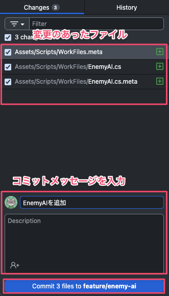 一番下の「Commit〜」ボタンを押すことでコミットされます。