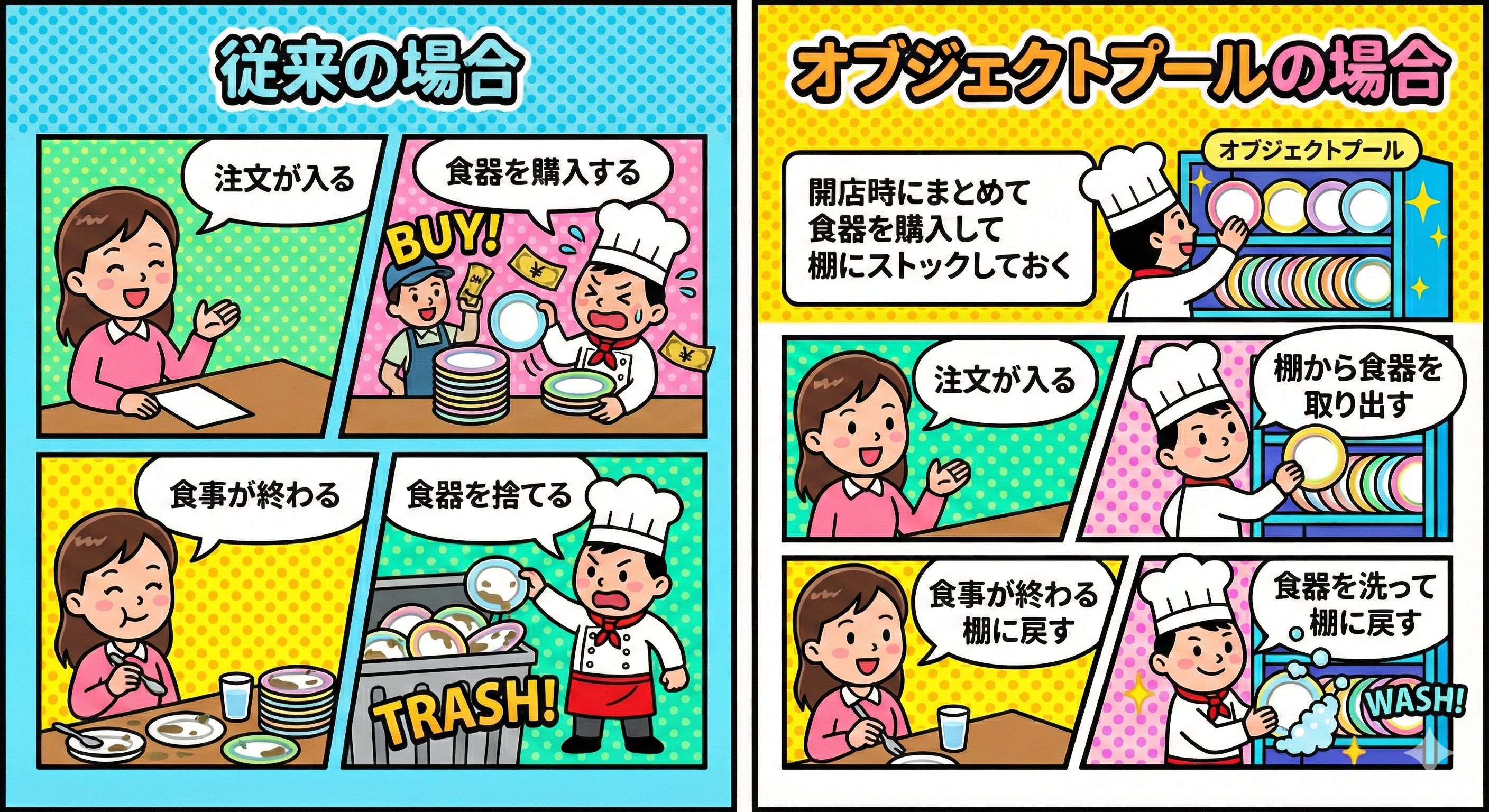 比べてみると、オブジェクトプールの方が効率がよいのがイメージできると思います。