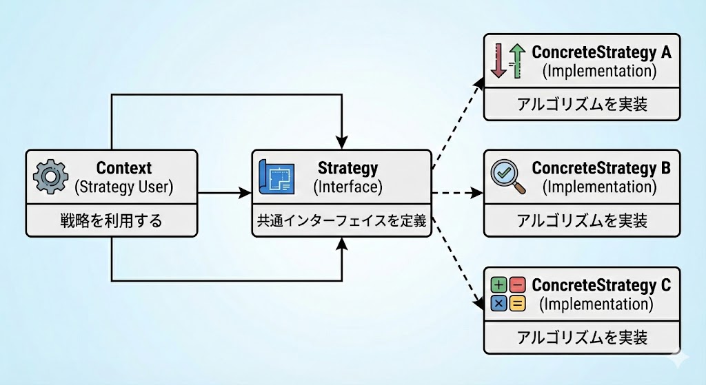 Strategy(戦略インターフェイス) - アルゴリズムの共通インターフェイスConcreteStrategy(具体的な戦略) - 各アルゴリズムの実装クラスContext(コンテキスト) - 戦略を使用するクラス