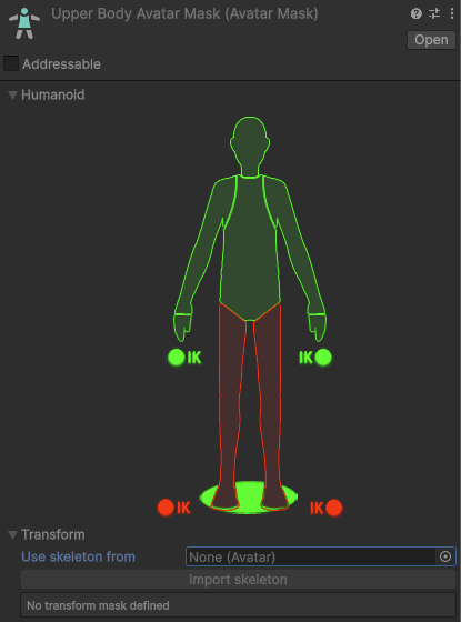 Avatar Maskは、アニメーションを体のどの部位に適用するかを定義するアセットです。
