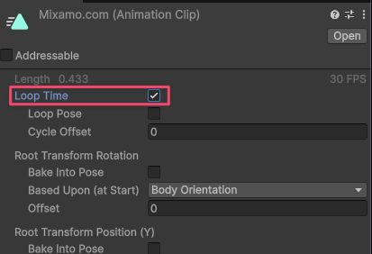 コピーした Animation Clip を選択し、Inspector の「Loop Time」にチェックを入れるとループ再生されるようになります。歩きや走りなど、繰り返し再生したいアニメーションに設定してください。