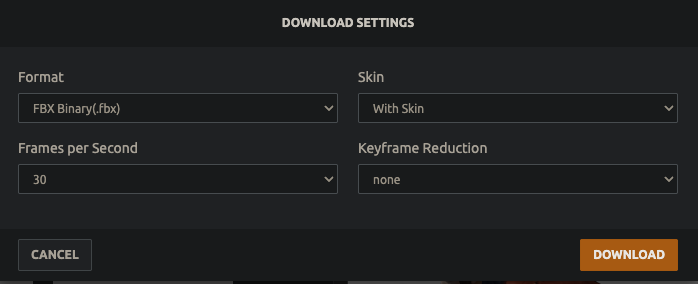 - ダウンロード時は FBX Binary 形式を選択