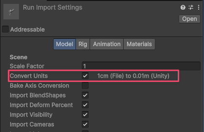 FBXのInspector「Model」タブで Convert Units にチェックが入っていれば、Unityがメートル単位へ自動変換してくれます。