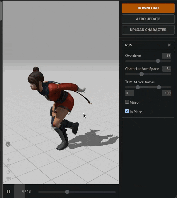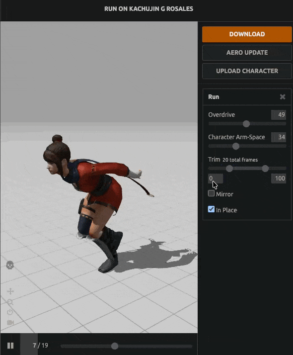 歩きや走りなど、キャラクターが移動するアニメーションには「In Place」というチェックボックスが表示されます。